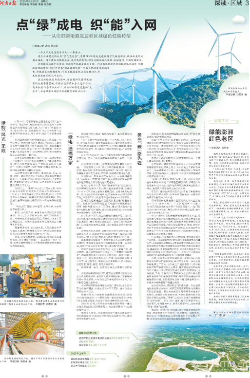 澎湃綠電助推綠色產(chǎn)業(yè)。圖為萬華生態(tài)集團(tuán)禾香生態(tài)板材生產(chǎn)線(劉宏冰 攝) 當(dāng)前,我國進(jìn)入新的發(fā)展階段,放眼河南,各地都在加快布局新能源發(fā)展,推動產(chǎn)業(yè)升級。在比亞迪等新能源工廠導(dǎo)入、上汽新工廠建設(shè)助推下,鄭州新能源汽車產(chǎn)銷實現(xiàn)躍遷式增長,首次躋身國內(nèi)新能源汽車產(chǎn)量前十名;南陽市政府印發(fā)若干政策措施,支持淅減、飛龍、眾德等汽車零部件企業(yè)實現(xiàn)產(chǎn)品從配套燃油汽車向新能源汽車轉(zhuǎn)變;焦作市加快建設(shè)中部新能源材料城,龍佰集團(tuán)鈦白粉產(chǎn)能規(guī)模全球第一,多氟多六氟磷酸鋰產(chǎn)銷量全球第一…… 在這場轉(zhuǎn)型中,信陽勇當(dāng)“碳”路先鋒。作為國家首批碳達(dá)峰試點城市,信陽正積極探索降碳與發(fā)展協(xié)同的信陽經(jīng)驗。豫東南高新區(qū)前瞻布局零碳智慧產(chǎn)業(yè)園區(qū),光儲充檢智能超充站、大灣區(qū)低碳創(chuàng)新示范園等項目加速落地。“零碳”已成為信陽吸引高端要素的“金字招牌”。華為、360、百度、愛奇藝等數(shù)字巨頭紛紛落子,布局算力中心、培育大模型產(chǎn)業(yè),加快構(gòu)建“綠電+綠算”生態(tài)圈。 信陽馭“風(fēng)”追“光”的實踐,為河南加速能源結(jié)構(gòu)轉(zhuǎn)型、培育新質(zhì)生產(chǎn)力提供了強勁推力。綠能澎湃,新質(zhì)生長,中原大地正以信陽等地的先行實踐為引擎,堅定邁向綠色低碳的高質(zhì)量發(fā)展新征程。 記者手記:綠能澎湃紅色老區(qū) 河南日報客戶端記者 劉宏冰 越野車轟鳴著攀上黃柏山棋盤石,我看到24座“馭風(fēng)巨人”傲立山脊,百米長的葉片劃破長空,發(fā)出沉穩(wěn)有力的呼嘯。這風(fēng),已不再是山間過客,而是點亮老區(qū)新生的能量之源。 “自從這些‘大家伙’立起來,大山里就沒停過電啦!”生于斯、長于斯,在大山里守了30多年的黃柏山林場場長丁大軍感嘆道。